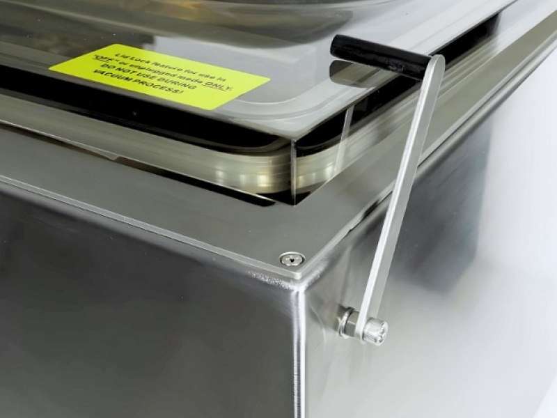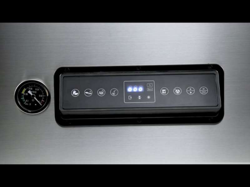 Επαγγελματικό μηχάνημα σφράγισης σε κενό σε ειδικές σακούλες για τρόφιμα. Ανοξείδωτη κατασκευή, εύκολο καθάρισμα και με διάφανο καπάκι για τον έλεγχο της διαδικασίας συσκευασίας. Περιλαμβάνει 'panel' πίνακα χειρισμού και διαθέτει 5 προγράμματα.