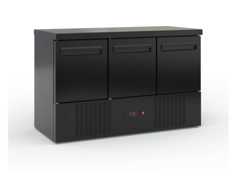 Επαγγελματικό ψυγείο πάγκος συντήρηση μαύρο με 3 πόρτες και μηχανή κάτω.