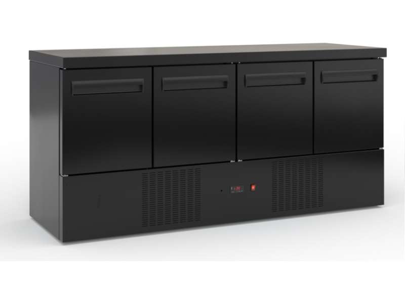 Επαγγελματικό ψυγείο πάγκος συντήρηση μαύρο με 4 πόρτες και μηχανή κάτω.