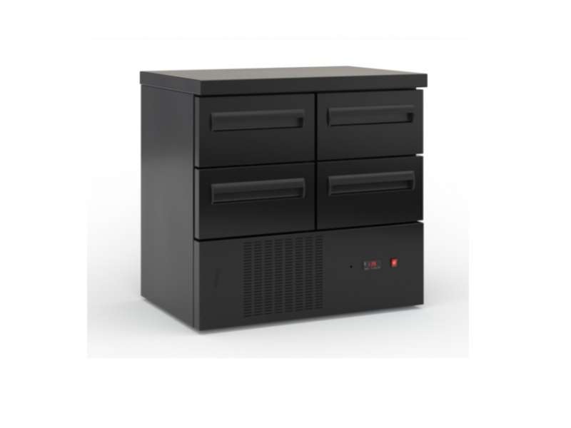 Επαγγελματικό ψυγείο πάγκος συντήρηση μαύρο με 4 συρτάρια και μηχανή κάτω.