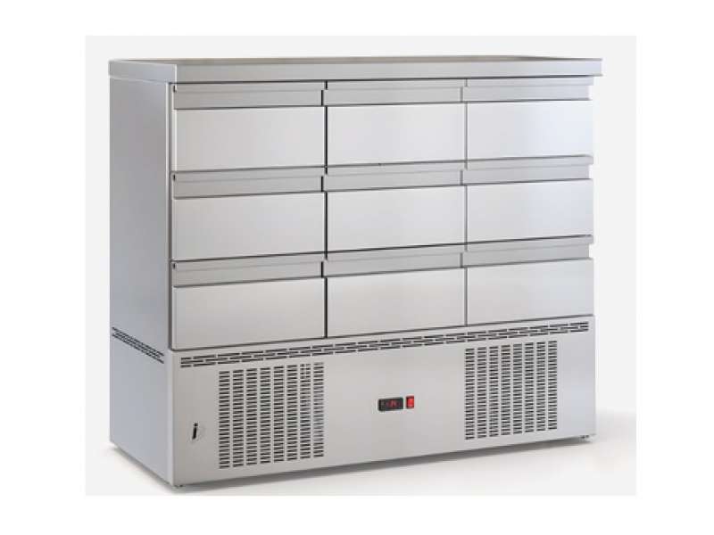 Επαγγελματική αποθήκη ψαριών συντήρηση με μηχανή κάτω στατικής ψύξης με 9 συρτάρια απο ανοξείδωτο χάλυβα.