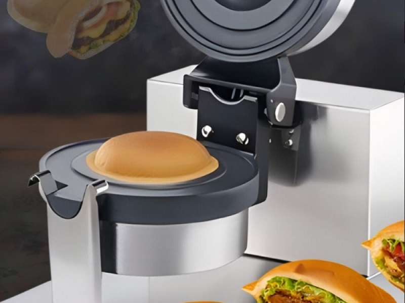 Επαγγελματική συσκευή παρασκευής burger με αντικολλητικές πλάκες και σφράγιση του ψωμιού. Κατασκευή μηχανήματος από ανοξείδωτο ατσάλι και εύρος θερμοκρασίας 50-300°C. Άνοιγμα πλακών 90° και ομοιόμορφο περιστροφικό ψήσιμο. Εσωτερική διάμετρος εστίας 101,28mm. Εξωτερική διάμετρος θερμής πλάκας 197,04mm. Ιδανικό για καφέ, ζαχαροπλαστεία, μπαρ και ξενοδοχεία.