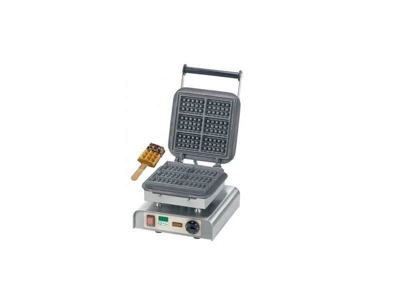 6 βάφλες τετράγωνες στο ξυλάκι 310x340x250mm. Ιδανικό σχήμα και μέγεθος για σερβίρισμα στο χερί ή στο πιάτο. Ψήνει ταυτόχρονα 6 κομμάτια σε 2 λεπτά. Ιδανικό για εταιρείες που θέλουν μεγάλη παραγωγή.