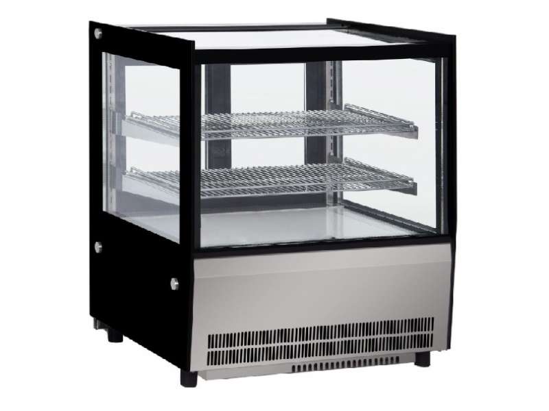 Επιτραπέζια Βιτρίνα Ψυχόμενη της εταιρείας Dynamic με ίσια κάθετα διπλά θερμομονωτικά κρύσταλλα και βαμμένο πλαίσιο μαύρο περιμετρικά.