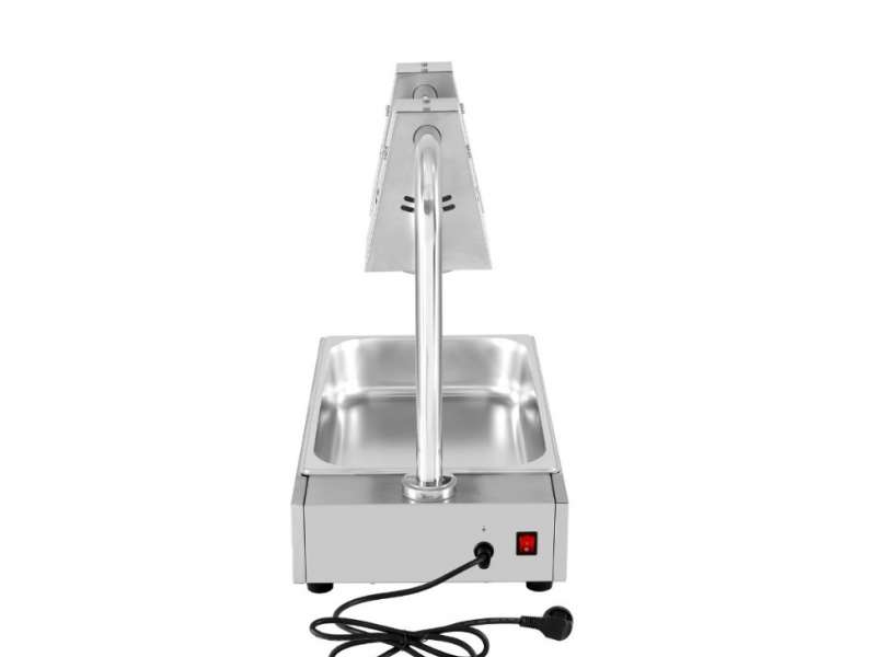 Επαγγελματικός Θερμαντήρας πατάτας κατασκευασμένος από ανοξείδωτο ατσάλι 201 για εύκολη εσωτερική και εξωτερική συντήρηση. Διαθέτει βάση που περιλαμβάνει ένα βαθύ δοχείο για να διατηρούνται φρέσκες οι τηγανιτές πατάτες, με ασφαλή και υγιεινό τρόπο. Με 2 λάμπες θερμότητας και με δοχείο GN1/1 διαστάσεων 65mm με πάχος 0,7mm. Η κατασκευή από ανοξείδωτο ατσάλι 201 εξασφαλίζει προστασία από την σκουριά και μεγαλύτερη διάρκεια ζωής. Με αυτόματη σταθερή θερμοκρασία 40-70°C, διατηρεί τα τρόφιμα ζεστά. Τα αντιολισθητικά λαστιχένια πόδια αποτρέπουν την ολίσθηση. Ιδανική για ταχυφαγεία, fast food, burger house, grill house, σουβλατζίσικα, ταβέρνες, self service restaurants κ.α.