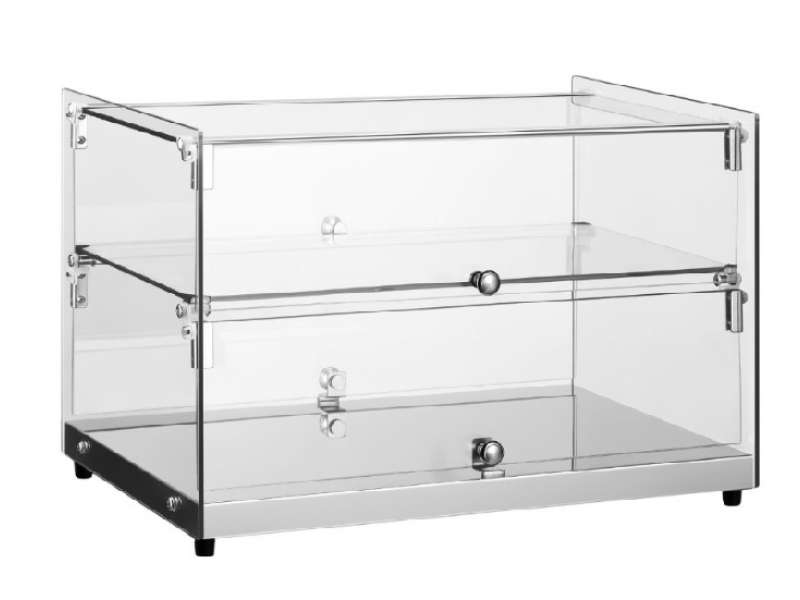 Βιτρίνα τροφίμων από ασφαλές γυαλί για ιδανική προβολή γλυκών, αρτοσκευασμάτων και σνακ σε επαγγελματικούς χώρους εστίασης. Η διάφανη κατασκευή της προσφέρει πανοραμική θέαση των προϊόντων από κάθε γωνία, προσελκύοντας τους πελάτες και διατηρώντας τη φρέσκια τους εμφάνιση. Σχεδιασμένη για μέγιστη ευελιξία στη διάταξη του καταστήματος, εξασφαλίζει ορατότητα από όλες τις πλευρές. Στιβαρή, επαγγελματική κατασκευή με βάση από ανοξείδωτο ατσάλι, ασφαλείς λαβές και σφραγισμένες γυάλινες πόρτες για υγιεινό περιβάλλον. Το εσωτερικό της καθαρίζεται εύκολα εξασφαλίζοντας άψογο και επαγγελματικό προφίλ. Μια πρακτική και κομψή λύση για κάθε επιχείρηση.