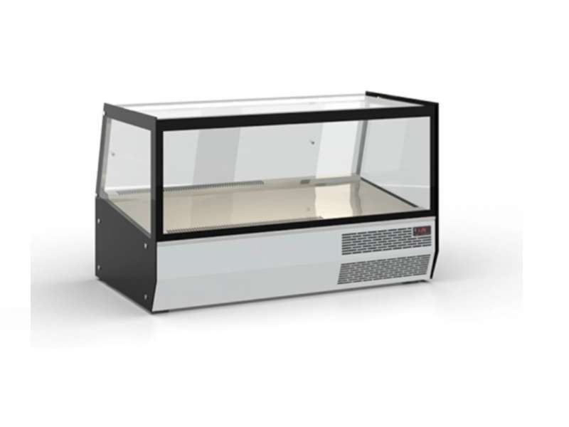 Επιτραπέζια βιτρίνα συντήρησης με κυκλοφορία αέρα από ανοξείδωτο χάλυβα με διπλά τζάμια με μαύρο περίγραμμα.