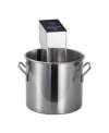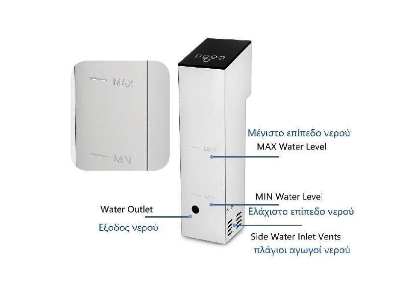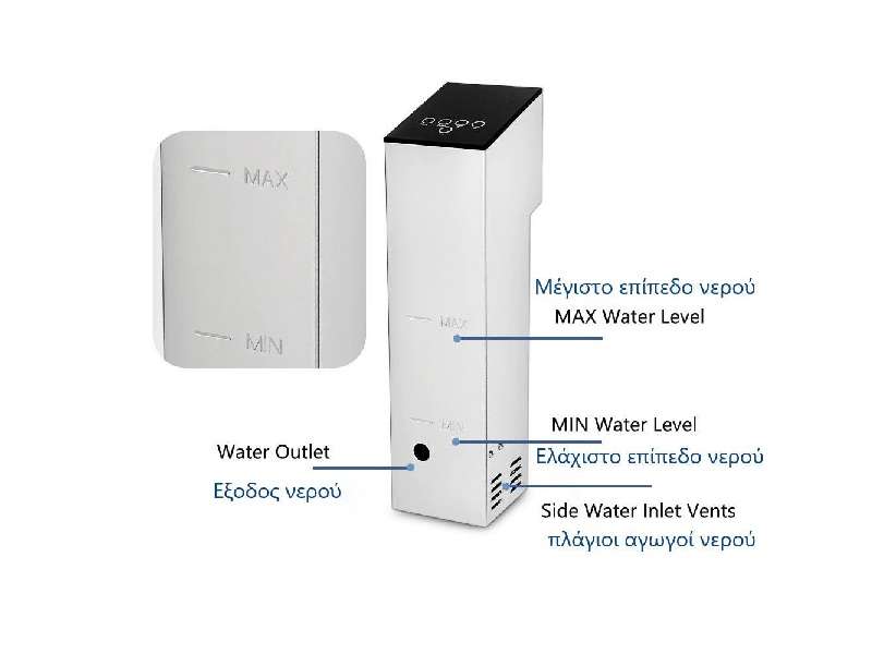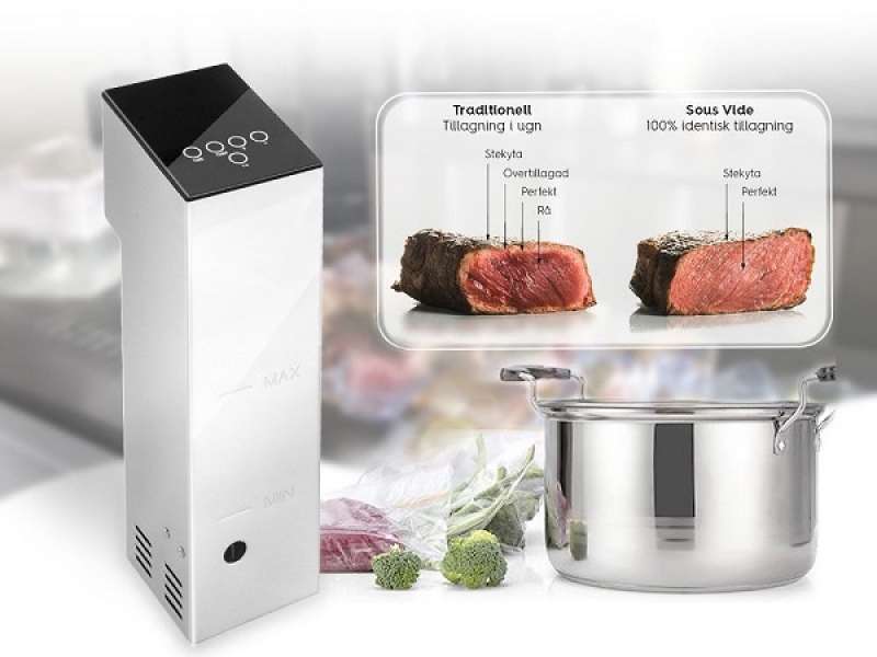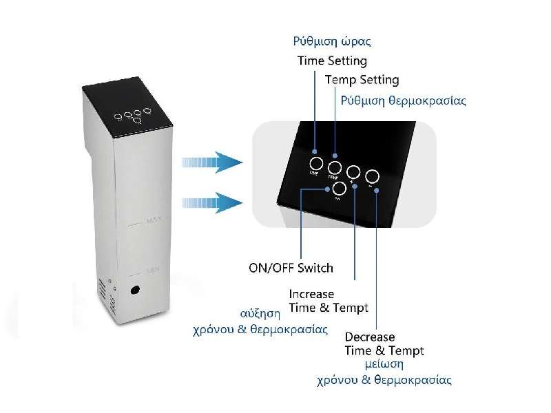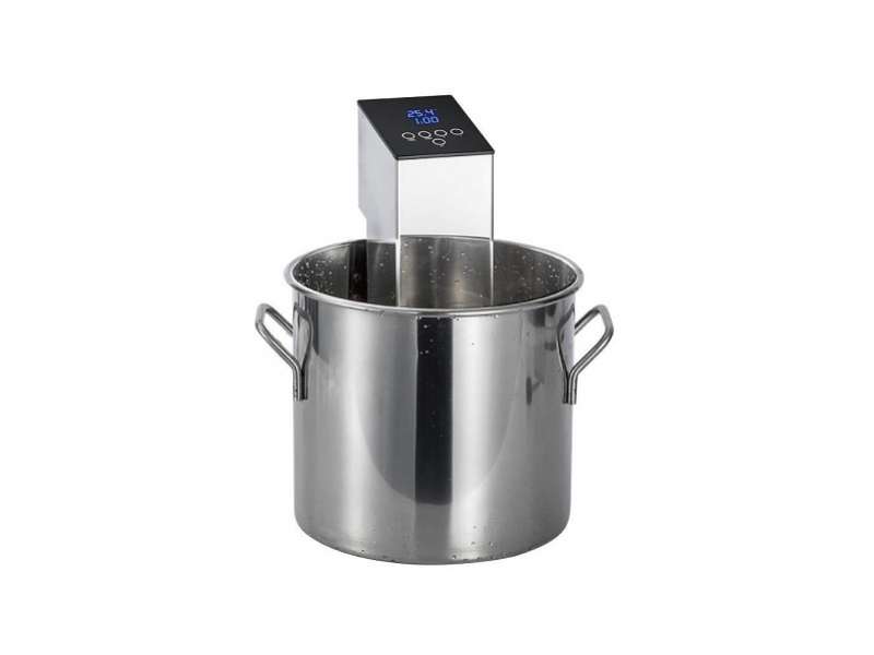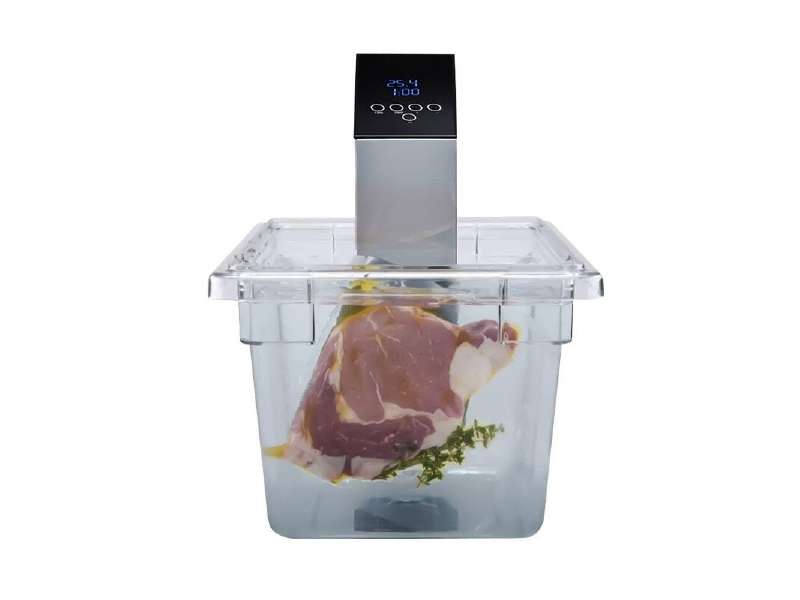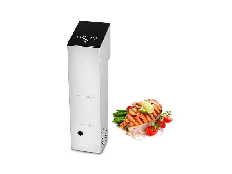 Μηχάνημα μαγειρέματος με την μέθοδο Sous Vide - Κυκλοφορητής Εμβάπτισης για Αργό Μαγείρεμα. Οθόνη LED για ορατή διαδικασία και ευκολία στη χρήση. Με σύστημα κυκλοφορίας νερού 360°, το sous vide θερμαίνει το νερό με ασφαλή και ομοιόμορφο τρόπο, θερμαίνοντας γρήγορα το νερό στην επιθυμητή θερμοκρασία. Διαθέτει ρυθμιζόμενο χρονόμετρο και ρυθμιζόμενο σύστημα θερμοκρασίας. Είναι κατασκευασμένο εξ ολοκλήρου από ανοξείδωτο χάλυβα. Ισχυρό και αδιάβροχο εργαλείο. Αισθητήρες θερμοκρασίας και χρονοδιακόπτης μεγάλης αντοχής. Ο σχεδιασμός του με πίσω γάντζο είναι κατάλληλος για εφαρμογή σε πολλούς τύπους δοχείων. Εύκολο στη χρήση στην κουζίνα ή στο σπίτι. Απλώς σφραγίστε τα τρόφιμα σε μια σακούλα κενού και μετά βάλτε τα σε ένα δοχείο με νερό. Βάλτε το slow cooker στο δοχείο και προσαρμόστε την κατάλληλη ποσότητα νερού. Στη συνέχεια, ενεργοποιήστε την συσκευή, πατήστε και κρατήστε πατημένο το κουμπί «ON» και στην οθόνη θα εμφανιστεί η τρέχουσα θερμοκρασία. Χρησιμοποιήστε το +/- στον μπροστινό πίνακα για να ρυθμίσετε τη θερμοκρασία και τον χρονομετρητή. Τέλος, όταν το φαγητό φτάσει στην επιθυμητή θερμοκρασία και χρόνο, βγάλτε το και είναι έτοιμο.