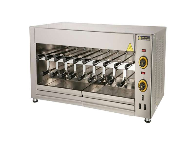 Ηλεκτρικές ψησταριές που χάρη στον πρωτοποριακό σχεδιασμό τους παρέχουν ευκολία στο χειρισμό, οικονομική λειτουργία και ελκυστική εμφάνιση. Ένα πολυμηχάνημα ιδανικό για κάθε επαγγελματία που ασχολείται με το ψήσιμο. Η απόλυτη λύση για όλα τα κοντοσούβλια (κεμπάπ, κλέφτικο, γαρδούμπες κοκορετσάκια, κότσια, εξωτικές σπεσιαλιτέ). Δυνατότητα χρήσης σαν γκριλ αφού διαθέτει και σχάρες. Ψήνει μεγάλες ποσότητες κρεατικών γρήγορα, ομοιόμορφα και χωρίς συνεχή επιτήρηση. Δεν καπνίζει γιατί η φωτιά είναι επάνω από τα ψητά και επομένως τα λίπη δεν καίγονται. Ολόκληρη η συσκευή κατασκευάζεται από ανοξείδωτο χάλυβα και ανταποκρίνεται στις αυστηρότερες προδιαγραφές ασφάλειας. Τα λίπη συγκεντρώνονται σε συρταρωτό λιποσυλλέκτη στο κάτω μέρος. Οι σούβλες περιστρέφονται με ταχύτητα 2 στροφές ανά λεπτό.