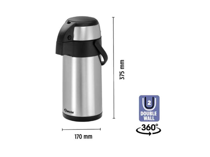 Περιστρεφόμενη ισοθερμική κανάτα με διπλό τοίχωμα και λαβή μεταφοράς για πρακτικό εφοδιασμό ζεστών ροφημάτων έως 3 λίτρα. Το σύστημα άντλησης καθιστά δυνατή την εύκολη δοσολογία ανάλογα με τις απαιτήσεις.