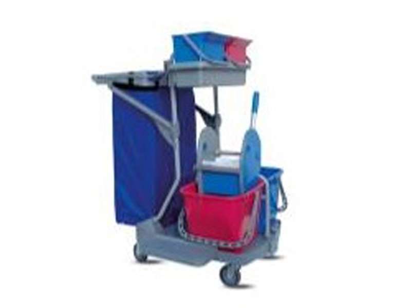 Πολυχρηστικό καρότσι σφουγγαρίσματος κατασκευασμένο από ανθεκτικό πολυπροπυλένιο. Με ρόδες από λάστιχο βάση για σκούπα ή παρκετέζα, καλάθι με δύο κάδους 6λτ, δύο κάδους 15λτ και βάση στήριξης για το σάκο σκουπιδιών. Εκθεσιακό κομμάτι