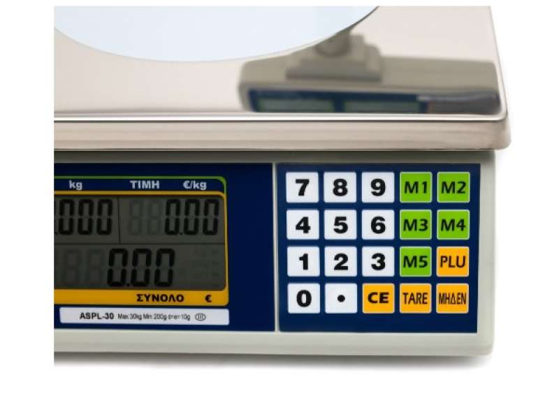Εξαιρετικό μοντέλο ζύγισης με δυνατότητα τιμολόγησης και πιστοποιητικό OIML. Η ζυγαριά ASPL είναι εξοπλισμένη με μεγάλη φωτιζόμενη οθόνη LCD 3 σε 1 τριών ενδείξεων για τον χειριστή και τον πελάτη. Δυνατότητα υπολογισμού ρέστων και τροφοδοσία μπαταρίας DC: 4Ah/6V επαναφορτιζόμενη. Διάρκεια μπαταρίας 100 ώρες με μία φόρτιση. Πληκτρολόγιο με 3 ορατές μνήμες, τάσι: 250x360mm με κολώνα και τάσι λαϊκής: 260x290mm. 'Ένδειξη βάρους, τιμή μονάδος, συνολική τιμή, ένδειξη χαμηλής μπαταρίας. Ιδανική για κρεοπωλεία, ζαχαροπλαστεία, ιχθυοπωλεία, οπωροπωλεία καταστήματα αλλαντικών και ξηρών καρπών.