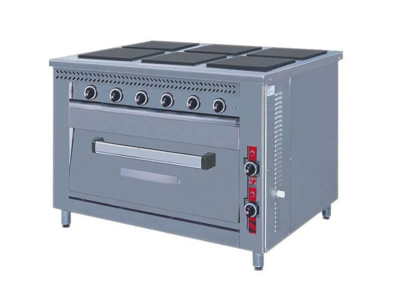 Ηλεκτρική κουζίνα με 6 εστίες 30 x 30 cm. Με συρτάρι περισυλλογής, με ράφι / σχάρα στη μέση του φούρνου. Διαστάσεις φούρνου: 2 x (90 x 68 x 13) cm Ισχύς φούρνου: 6.000 W