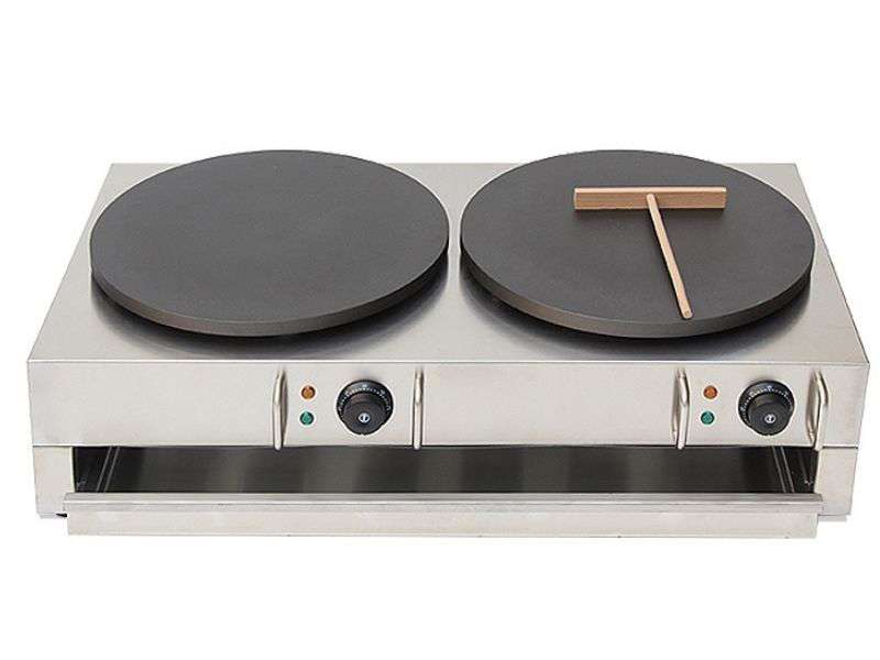Διπλή Ηλεκτρική κρεπιέρα με πλάκες μαντεμένιες. Ανοξείδωτη κατασκευή. Υπερυψωμένη τετράγωνή βάση. Ενδεικτική λυχνία λειτουργίας.