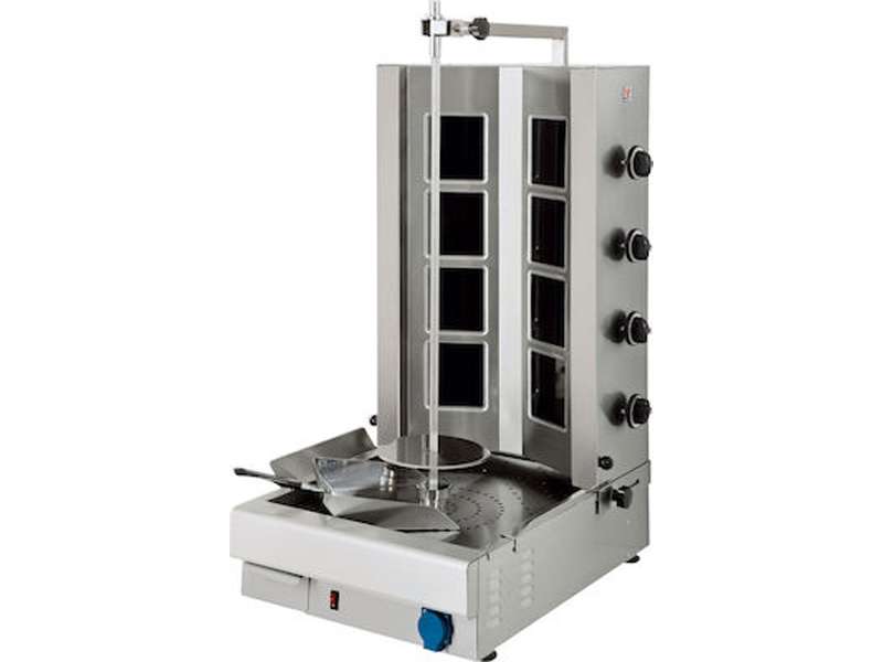 Ηλεκτρικός γύρος 4 διακοπτών με κεραμική εστία. Κατάλληλο για 75-100 κιλά γύρο. Ο Ηλεκτρικός Γύρος MK8 έχει το μοτέρ στο κάτω μέρος της συσκευής. Σκοπός είναι να προφυλάξει το μοτέρ από την θερμοκρασία και το λίπος ώστε να διασφαλιστεί η σωστή λειτουργία της συσκευής. Η εστία θερμότητας μετακινείτε εμπρός και πίσω για το επιθυμητό αποτέλεσμα κατά την διάρκεια ψησίματος. Οι κεραμικές αντιστάσεις προσφέρουν γρήγορο και οικονομικό ψήσιμο 40% λιγότερη κατανάλωση από τις συμβατικές αντιστάσεις. Η συσκευή διαθέτει πρίζα για την σύνδεση ηλεκτρικού μαχαιριού καθώς και ένα αποσπώμενο συρτάρι για την περισυλλογή λίπους κατά την διάρκεια ψησίματος. Τα αποσπώμενα μέρη που φέρει η συσκευή στο κάτω μέρος καθώς και η εστία θερμότητας καθαρίζονται πολύ εύκολα.