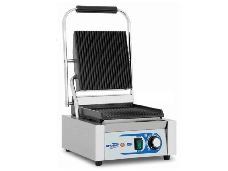 Επαγγελματική τοστιέρα της εταιρείας Dynamic με πάνω και κάτω ραβδωτη πλάκα.