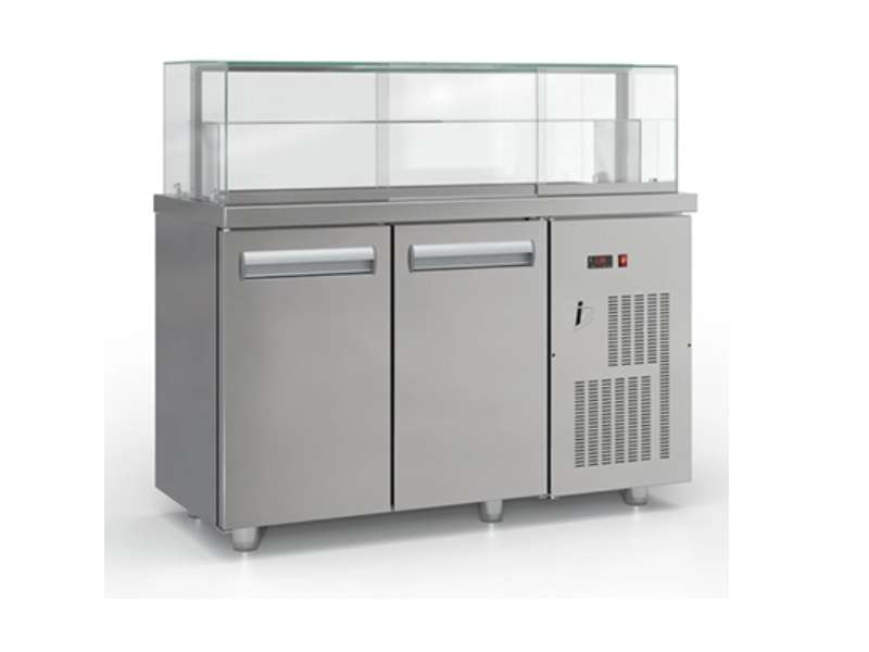 Επαγγελματικό ψυγείο βιτρίνα συντήρηση με επάλληλα τζάμια με 2 πόρτες και μηχανή από ανοξείδωτο χάλυβα.