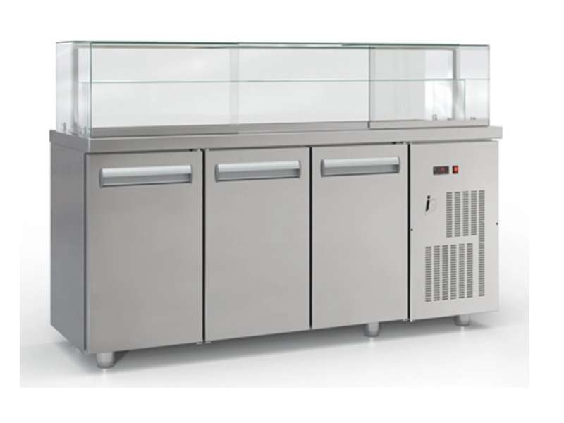 Επαγγελματικό ψυγείο βιτρίνα συντήρηση με επάλληλα τζάμια με 3 πόρτες και μηχανή από ανοξείδωτο χάλυβα.