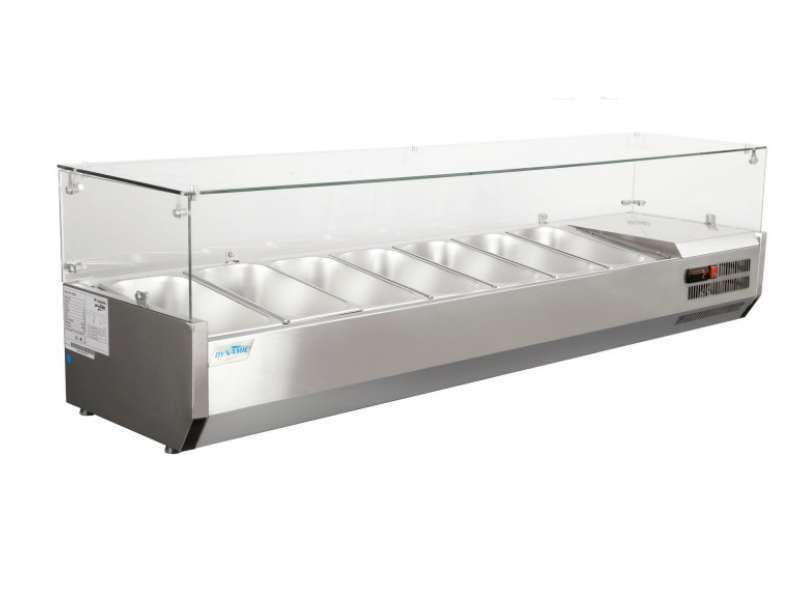 Ψυγείο σαλατών της εταιρείας Dynamic χωρητικότητας 7 GN 1/3 με ανοξείδωτη βάση, φωτισμό LED, ψηφιακό θερμοστάτη και σύστημα ψύξης με ανεμιστήρα.