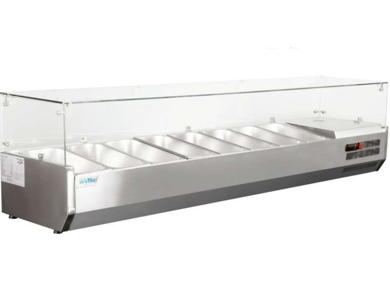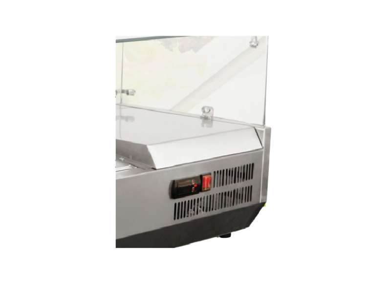 Ψυγείο σαλατών της εταιρείας Dynamic χωρητικότητας 8 GN 1/3 με ανοξείδωτη βάση, φωτισμό LED, ψηφιακό θερμοστάτη και σύστημα ψύξης με ανεμιστήρα.