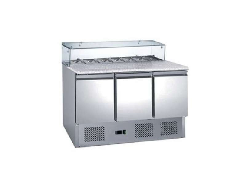 Πάγκος πίτσας ειδικά σχεδιασμένος για το ανοιγμα της ζύμης, να αποθηκεύει υλικά και να προετοιμάζει επικαλύψεις πίτσας απευθείας στην επιφάνεια εργασίας του. Το μοντέλο διαθέτει διαμερίσματα για λεκανακια GN, με ορθογώνιο γυάλινο ράφι πάνω από τα λεκανακια και πέτρινο πάγκο.