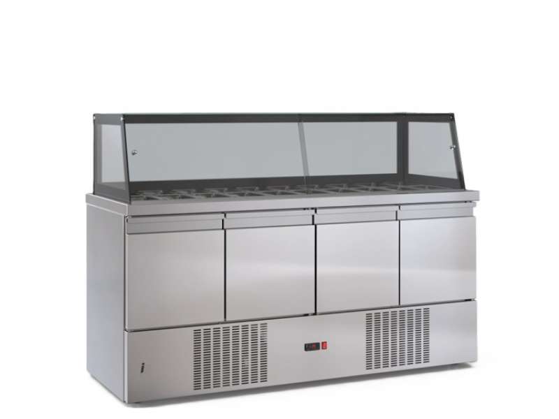 Επαγγελματικό ψυγείο σαλατών συντήρηση με μηχανή κάτω με 4 πόρτες από ανοξείδωτο χάλυβα.