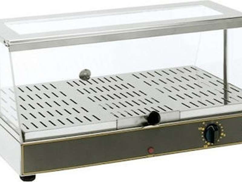 Θερμαινόμενη βιτρίνα από ανοξείδωτο μέταλλο και πορτάκια από plexiglass που ανοίγουν και από τις δύο πλευρές.