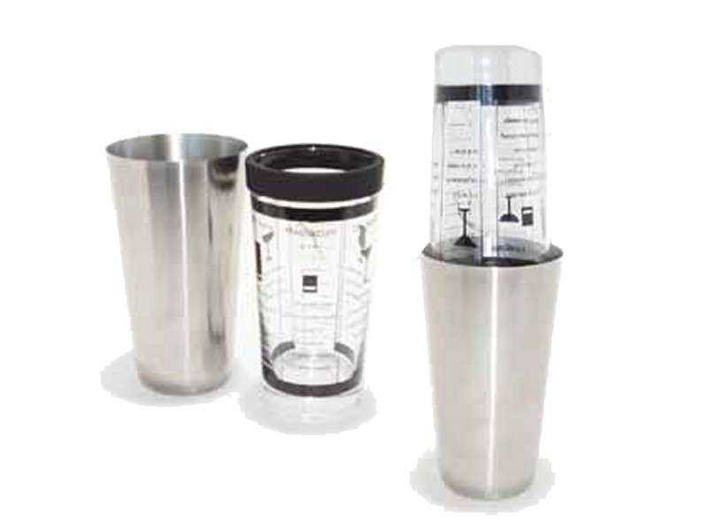 Το γνωστό σέικερ με τα 2 τεμ. Ποτήρι inox + ποτήρι γυάλινο με διαγραμμίσεις και λάστιχο.
