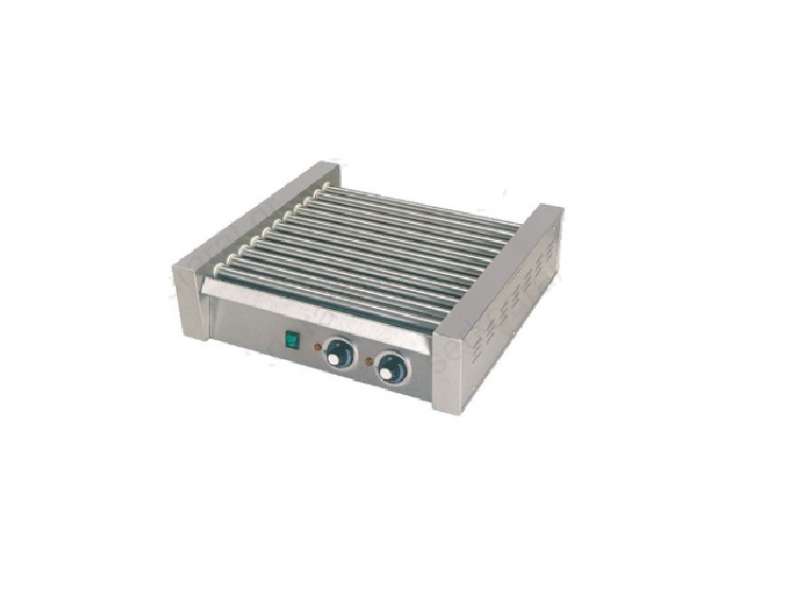 Συσκευή HOT DOG ROLLER, ανοξείδωτη κατασκευή, με 11 περιστρεφόμενους κυλίνδρους & θερμοστάτη ρύθμισης της θερμοκρασίας. Κατά την διαδικασία της λειτουργίας οι κύλινδροι ζεσταίνονται και ταυτόχρονα περιστρέφονται και έτσι ψήνουν τα λουκάνικα τα οποία τοποθετούνται ανάμεσα στους κυλίνδρους. Διαθέτει ανοξείδωτο ταψί ώς λιποσυλλέκτη το οποίο βγαίνει και πλένεται όταν κριθεί απαραίτητο. Οι κύλινδροι είναι καλό να καθαρίζονται όταν η συσκευή δεν έχει κρυώσει εντελώς και να φεύγουν λίπη, λάδια και υπολείμματα τροφών.