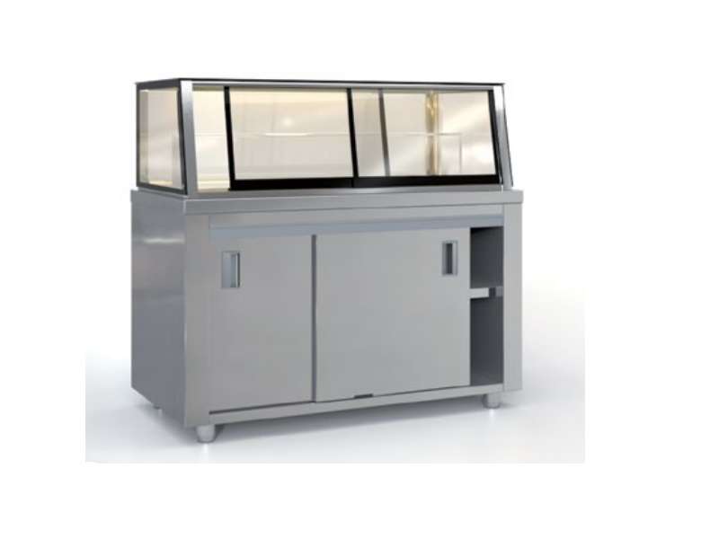 Επαγγελματική θερμαινόμενη βιτρίνα Panini με κυκλοφορία αέρα με 2 συρόμενες πόρτες και εσωτερικά γυάλινο ράφι από ανοξείδωτο χάλυβα με μαύρη βαφή περιμετρικά της βιτρίνας.