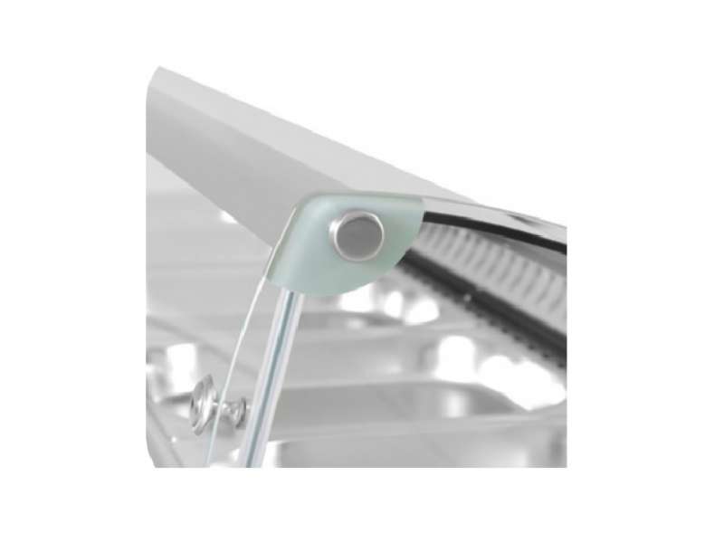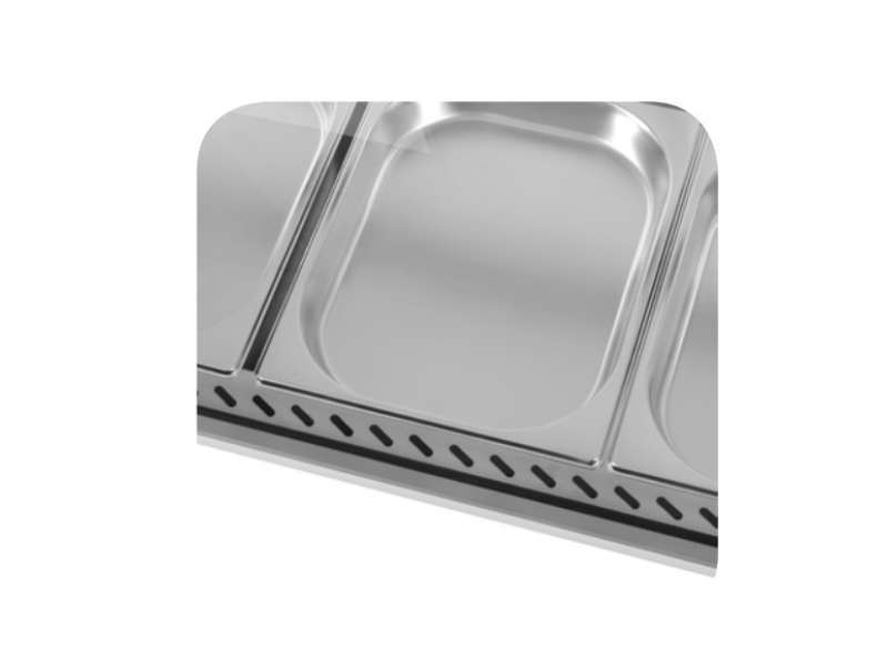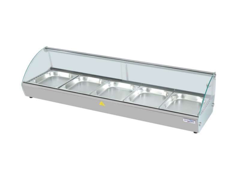 Θερμαινόμενη επιτραπέζια βιτρίνα της εταιρείας Dynamic χωρητικότητας 5 GN ½-40mm με ρυθμιζόμενο έλεγχο θερμοκρασίας και θερμαντικό σωλήνα ως σύστημα θέρμανσης. Πρόκειται για μια κατασκευή με ανοξείδωτο μπροστινό μέρος, γυάλινη καμπυλωτή πρόσοψη και 2 συρόμενες πόρτες.