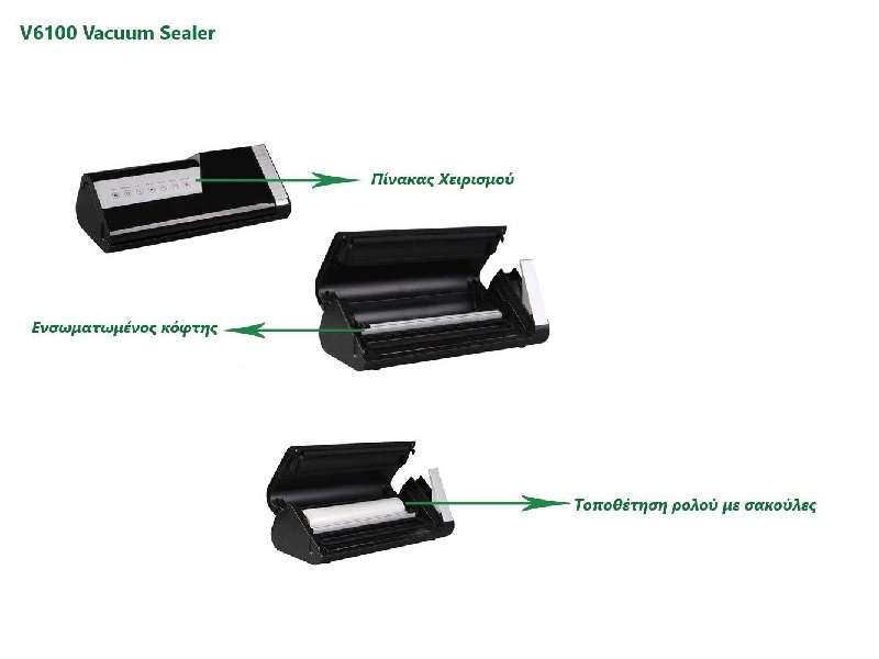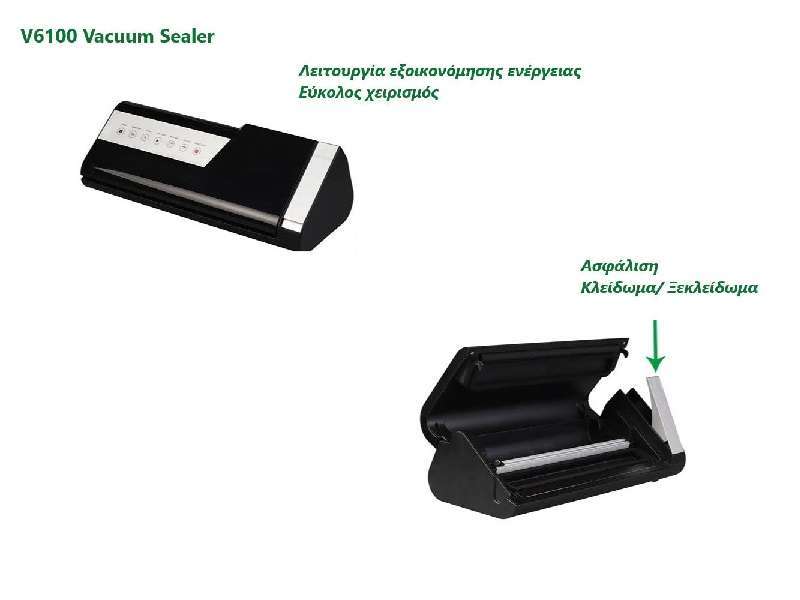 Vacuum κενού αέρος ιδανικό για τρόφιμα, λαχανικά, φρούτα, ψάρια, κρέας, σνακ, ρύζι, αλεύρι και υγρά υλικά. Ηλεκτρικό με ημιαυτόματη λειτουργία. Παρατείνει την διάρκεια ζωής των τροφίμων x 5 φορές περισσότερο από τις συμβατικές μεθόδους αποθήκευσης και διατηρεί την φρεσκάδα αφαιρώντας τον αέρα που θα προκαλούσε αλλοίωση. Συμπληρώνει τις μεθόδους μαγειρέματος Sous Vide. Ενσωματωμένη αποθήκευση ρολού και ενσωματωμένος κόφτης. Αφαιρούμενο κουτί αποθήκευσης υγρών που συλλαμβάνει τα υγρά υπερχείλισης. Διαθέτει μοναδικό σύστημα Easy-Lock και κουμπί "SEAL TIME + " για παράταση του χρόνου σφράγισης. Επίσης, έχει ξεχωριστό κουμπί για μαρινάρισμα και τα τρόφιμα μαρινάρονται πολύ γρήγορα, σε λίγα μόλις λεπτά. Πιστοποιήσεις: CE, GS, RoHS, SAA, ETL.